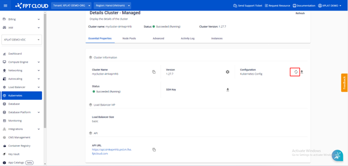 Bước 2 : Ở tab Essential Properties , mục Configuration chọn Renew kubeconfig