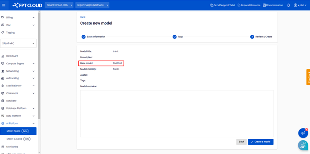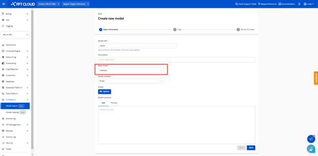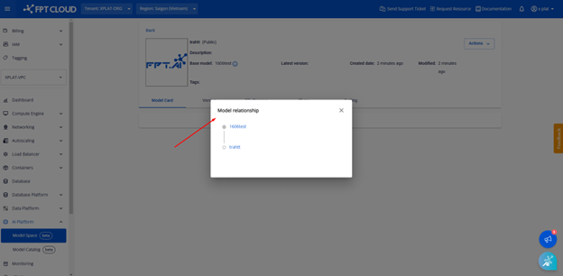 Mục đích: thể hiện mối quan hệ, biến thể của model từ một model khác theo thứ tự model gốc phía trên, model đang xem chi tiết ở dưới cùng. Các bước thực hiện để tạo Base Model Bước 1: Tại menu AI Platform, chọn sub menu Private Model, click button Create để tạo model Hubmới Bước 2: Tại step 1, nhập đầy đủ các thông tin như Title, Description, Model visibility... Bước 3: Tại trường Base model, click vào dropdown list để chọn model hub cha của model hub đang tạo Lưu ý: chỉ được phép chọn 1 base model. Trường này không bắt buộc, người dùng có thể để trống Bước 4: Click button Next, tại step 2 Tags, thực hiện chọn lần lượt các tag cho Framework, Architecture, Subject, Task, Others Bước 5: Click button Next, view lại toàn bộ thông tin của model hub đã tạo. Tại đây, người dùng sẽ thấy hiển thị thêm phần Base model như ví dụ dưới đây Bước 6: Sau khi các thông tin đã đúng và đầy đủ, click button Create a model Bước 7: Hệ thống chuyển sang màn model list với model hub vừa tạo thành công Bước 8: Đi đến màn hình chi tiết của model hub vừa tạo thành công, người dùng sẽ thấy hiển thị thêm phần Base model, kèm icon model relationship Click vào icon Model relationship, hiển thị popup thể hiện quan hệ cha con giữa 2 model. Popup cho phép click vào Model hub name để đi đến màn hình chi tiết của Model hub tương ứng
