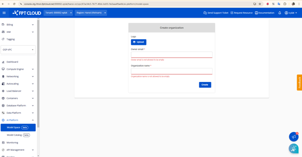 Mục đích: Sau khi tenant được active, người dùng lần đầu truy cập vào dịch vụ Model Hub trên tenant sẽ cần làm bước này, thực hiện create organization, sau đó mới sử dụng dịch vụ.