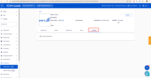 model-hubMục đích: Kích hoạt, bỏ kích hoạt chức năng deployment của modelModel Deployment Mục đích: Kích hoạt, bỏ kích hoạt chức năng deployment của model Bổ sung thêm 1 tab Setting trong chi tiết model, tại đây bạn có thể kích hoạt, bỏ kích hoạt chức năng deployment. Giá trị default khi model vừa được tạo sẽ là Disable