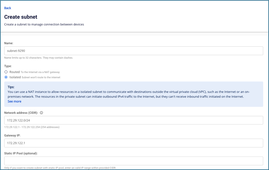 Tính năng chỉ áp dụng cho người dùng mua dich vụ loại General • Người dùng chọn mode isolated trong quá trình khởi tạo subnet. Hệ thống sẽ hiển thị thông tin hướng dẫn cách cấu hình Nat instance giúp các instance thuộc isolated network có thể ra ngoài nternet file
