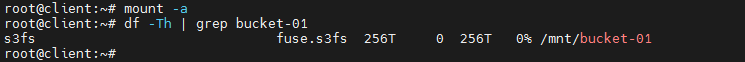 Copyecho bucket-01 /mnt/bucket-01 fuse.s3fs \_netdev,allow\_other,passwd\_file=/root/s3-password,use\_path\_request\_style,nonempty,uid=0,gid=0,use\_cache=/tmp,dbglevel=info,curldbg,url=https://s3-hfx03.fptcloud.com 0 0 >> /etc/fstab
