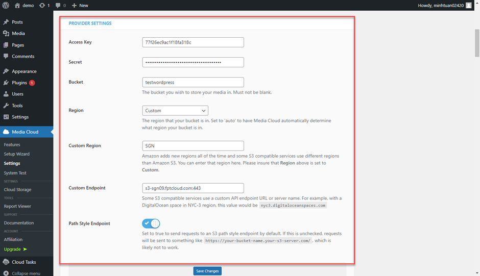 Truy cập vào trang quản trị của website WordPress, sau đó vào mục Plugin. Tìm plugin Media Cloud và tải về. file Sau khi kích hoạt bạn sẽ được yêu cầu nhập các thông tin Endpoint, Key, Bucket Name. Các thông tin này bạn có thể lấy từ FPT Portal theo hướng dẫn sau: Quản lý Access Key. Sau khi kết nối thành công, hãy chỉnh sửa lại một số cấu hình cơ bản để thuận tiện hơn cho quá trình sử dụng. file file Chọn các loại file sẽ được đồng bộ sang ở phần UPLOAD HANDLING file Cấu hình cơ chế xóa file, nên bật chế độ Delete From Storage để tối ưu dung lượng cho bucket. file Sau khi cấu hình thành công các file media được upload lên sau này đều sẽ được lưu trữ vào Bucket của FPT Smart Cloud. Bạn có thể kiểm tra bằng cách upload thử một ảnh lên và kiểm tra bên FPT Object Storage. file file