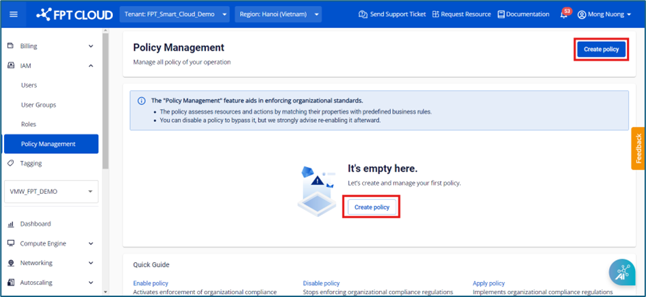 Bước 3 : Chọn Create policy. Hệ thống sẽ tiến hành khởi tạo Policy mới sẽ được hiển thị ở trang Policy Management.