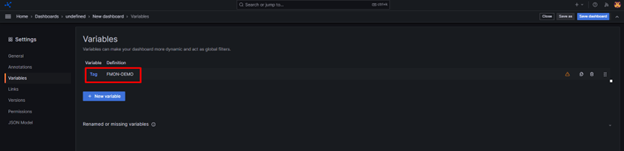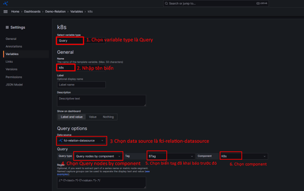 Để tạo một dashboard, người dùng thực hiện như sau: Bước 1 : Vào Home >> Dashboard >> New dashboard Bước 2 : Người dùng sẽ add variable trong dashboard bằng cách click icon Settings >> Chọn Variables >> Add variables Bước 3 : Khai báo tag có trong dashboard. Alt text Sau khi tạo xong sẽ có một variable được khai báo và hiển thị ở màn hình. Alt text Bước 4 : Tạo các biến tương ứng với các component bên trong tag. Alt text Click Apply để lưu biến. Các biến đã khai báo sẽ được hiển thị ở màn hình. Alt text Bước 5 : Save dashboard. Quay lại trang dashboard bằng cách chọn Home >> Dashboard >> Chọn dashboard đã tạo Trên dashboard lúc này sẽ hiển thị các variables mà người dùng đã khai báo. Alt text Bạn có thể add panel theo mong muốn để theo dõi.