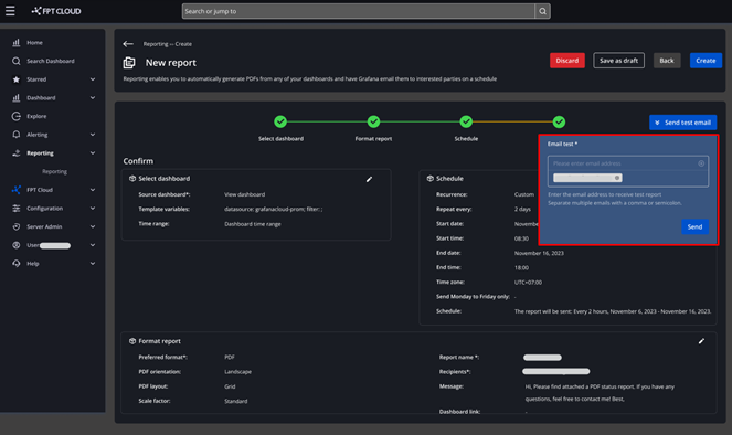 Chức năng Test send email hỗ trợ người dùng kiểm tra nội dung báo cáo và báo cáo được gửi thành công tới người nhận hay không. Để sử dụng chức năng này, bạn thực hiện theo hướng dẫn: Bước 1 : Click **Home > Apps > Reporting > Create a new report ** Bước 2 : Điền đầy đủ thông tin tạo report: Select Dashboard, Format Report, Schedule, Confirm Bước 3 : Click nút Send email test tại màn Confirm. Alt text Bước 4 : Xuất hiện hộp thoại nhập email test > Nhấn nút Send Bước 5 : Check hộp thư email nhận report