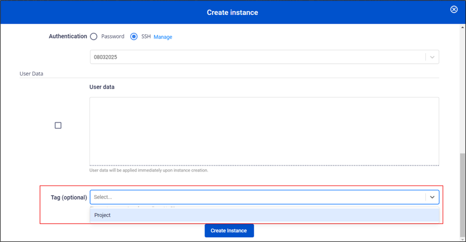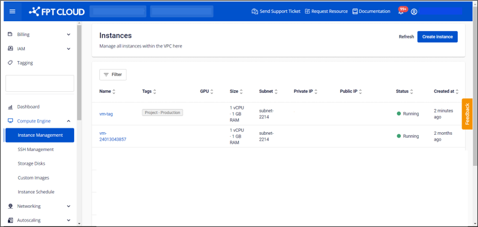 Bước 1 : Ở menu chọn Instance Management , chọn Create instance để khởi tạo một máy ảo file Bước 2 : Tại hộp thoại Create instance người dùng có thể chọn tag ở trường Add tag (optional) để gắn tag vào máy ảo. file Bước 3 : Người dùng điền các thông tin khác và nhấn Create để tạo máy ảo, tag được gắn vào máy ảo sẽ hiển thị trên trường Tags tại màn hình Instance Management file