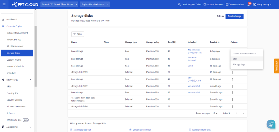 Bước 1 : Ở màn hình Storage disk , người dùng chọn disk, chọn Actions , sau đó chọn Manage tags