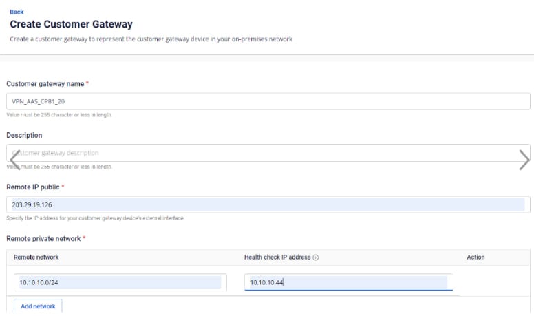 - Tạo Customer Gateway: