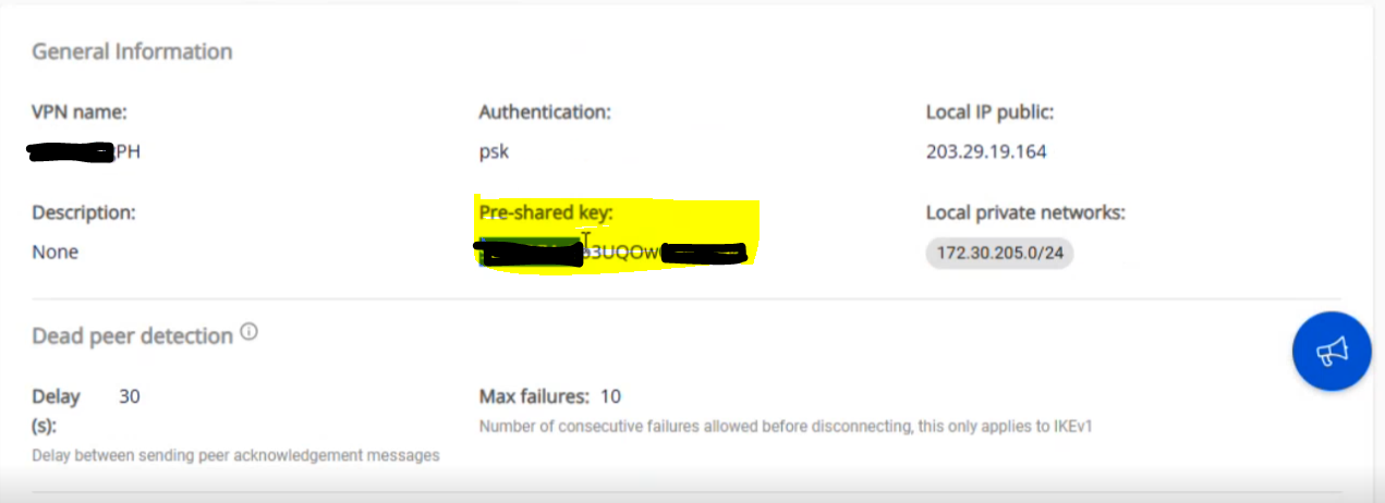 • Interface là WAN, trong trường hợp có nhiều WAN thì xác định WAN bạn cần. file Kiểm tra trạng thái của connection bên portal của FPT Smart Cloud file - Bật Local Gateway và chọn Primary IP file - Bật Method là Pre-shared Key và điền vào giống với thông số ở Bước 1: file Lưu ý: Mô hình của khách có thể sử dụng sau NAT, trong trường hợp dùng NAT thì cấu hình như sau+ Liên hệ L3-FCI để được support file - Cấu hình Phase 1 như sau: file