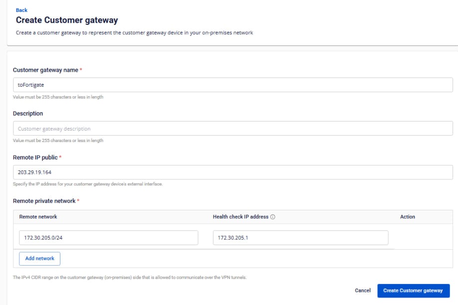 • Tạo Customer Gateway: