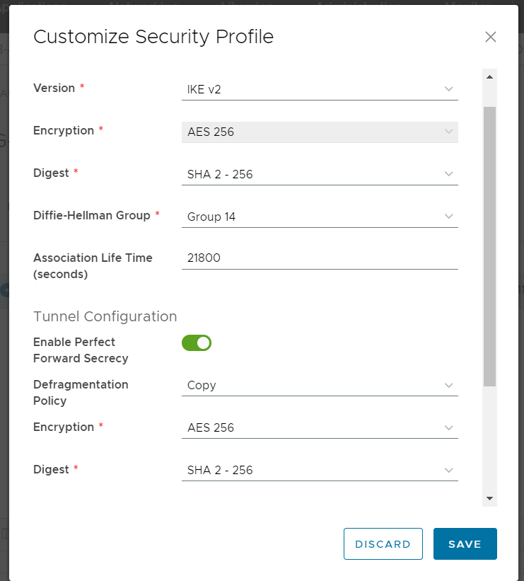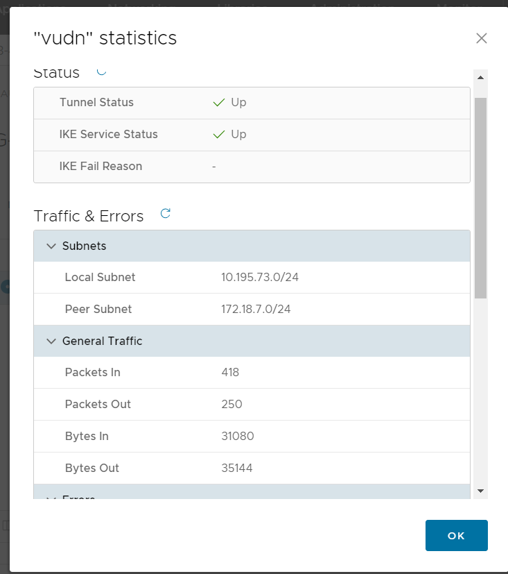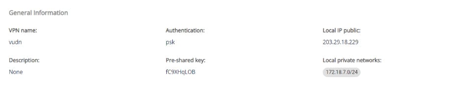 Với thông số "Pre-shared key" cần lưu lại để điền khi khởi tạo VPN Connection bên VMW. Thông số của VPN Connection sẽ bao gồm 3 mục chính: