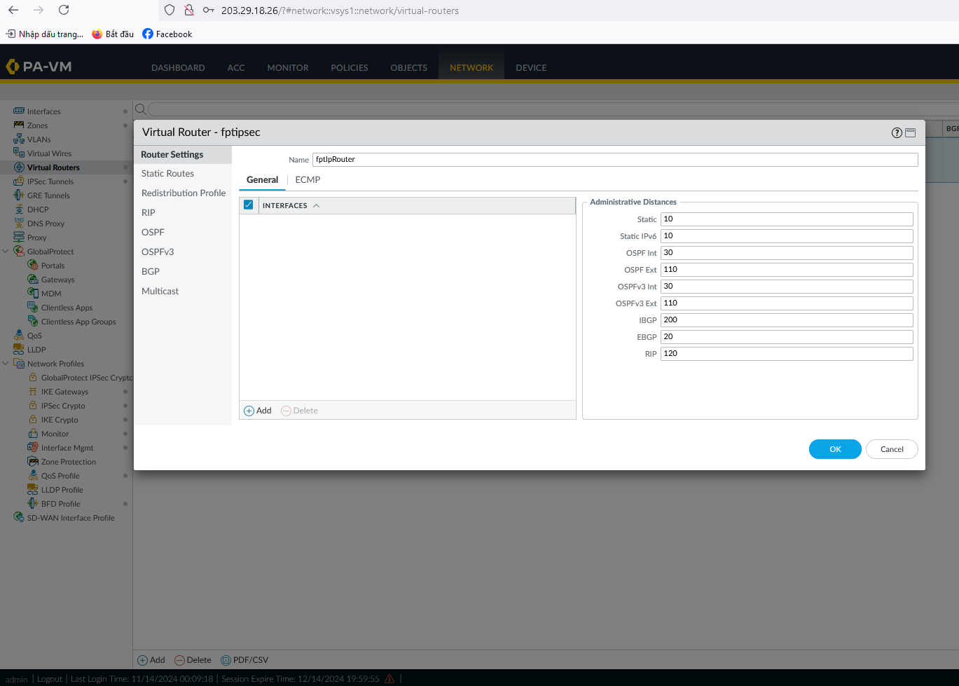 - Tạo Virtual Router của Palo Alto và chọn OK.