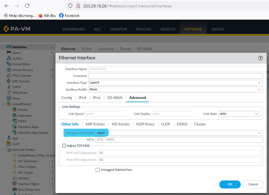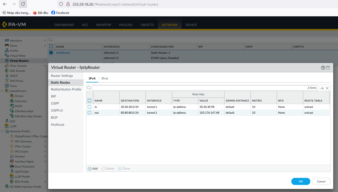 - Bước 3: Cấu hình firewall và routing cho Palo Alto