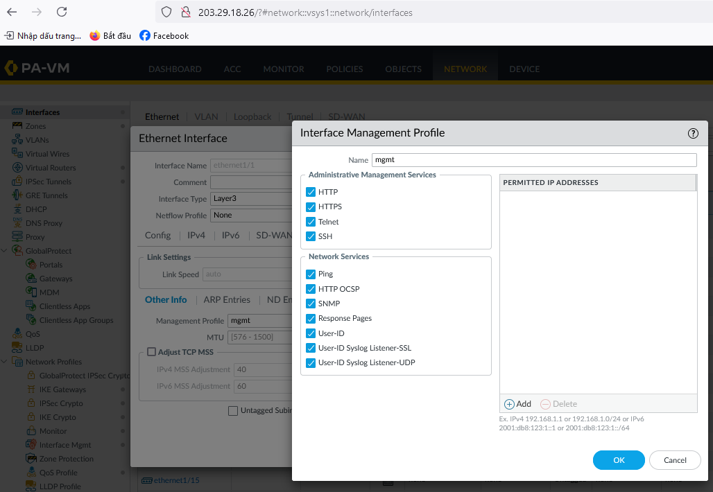 - Đăng nhập web vào Palo Alto khách hàng theo IP Management:
