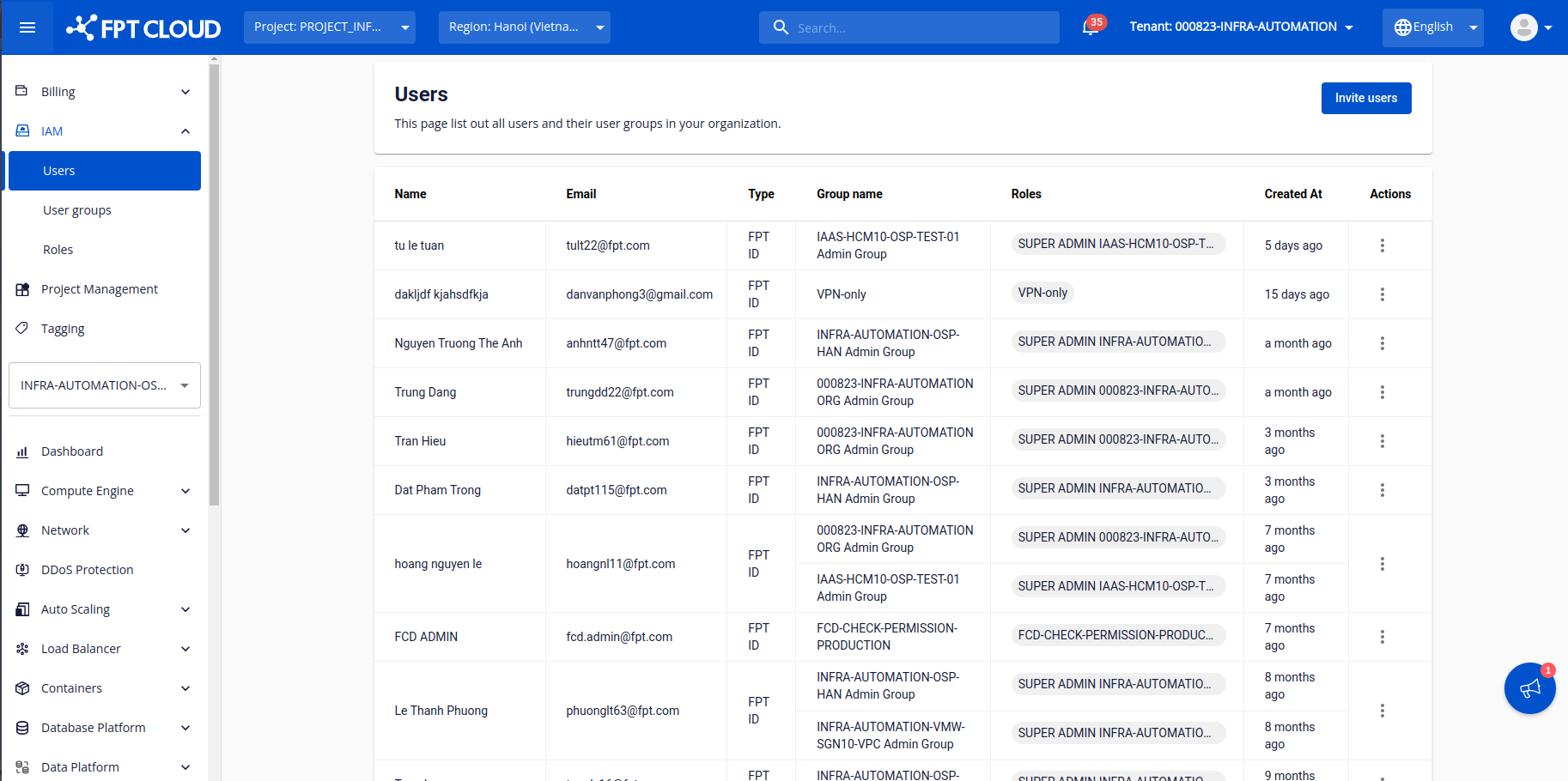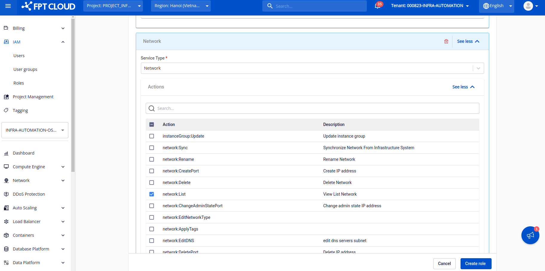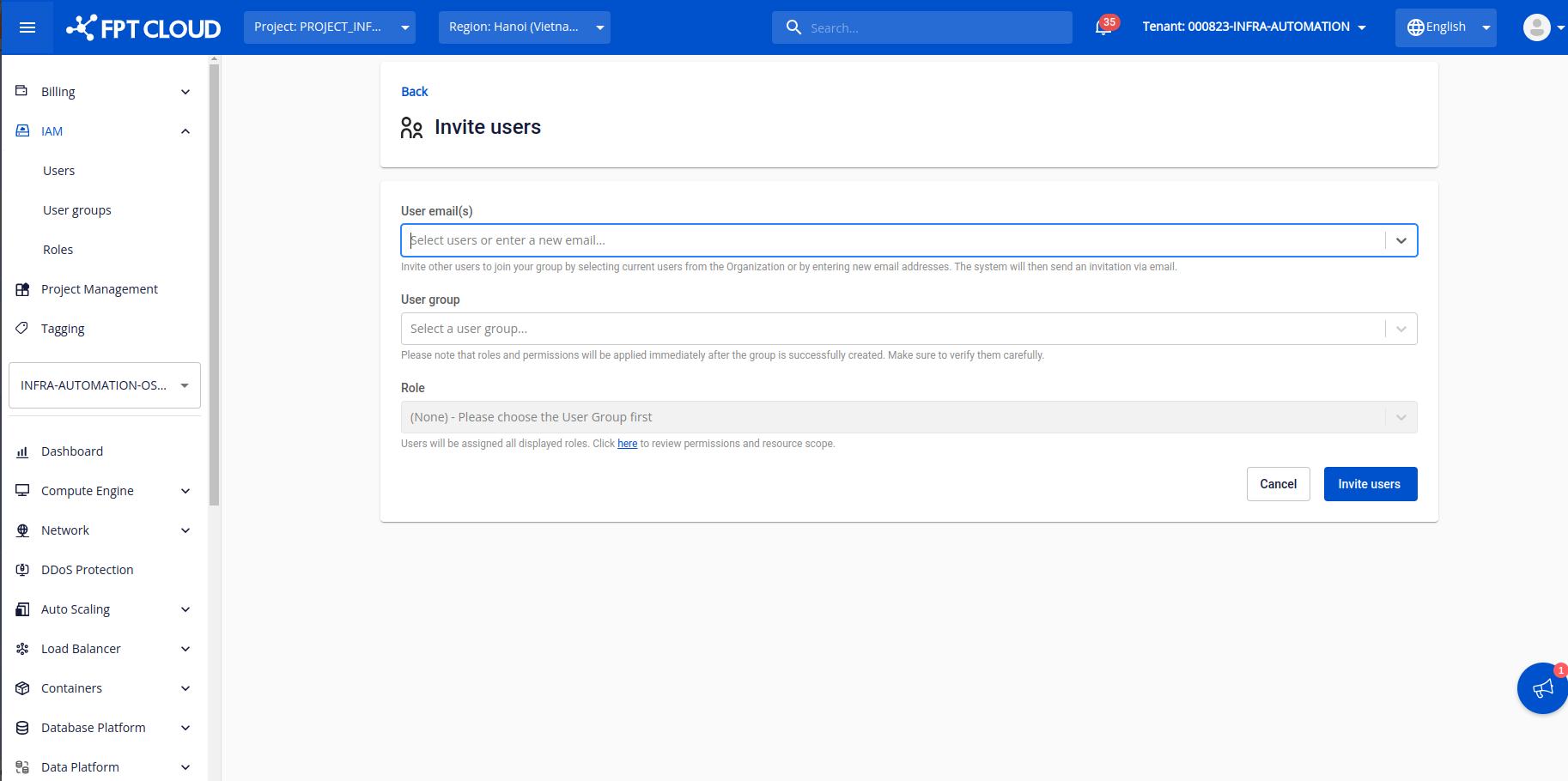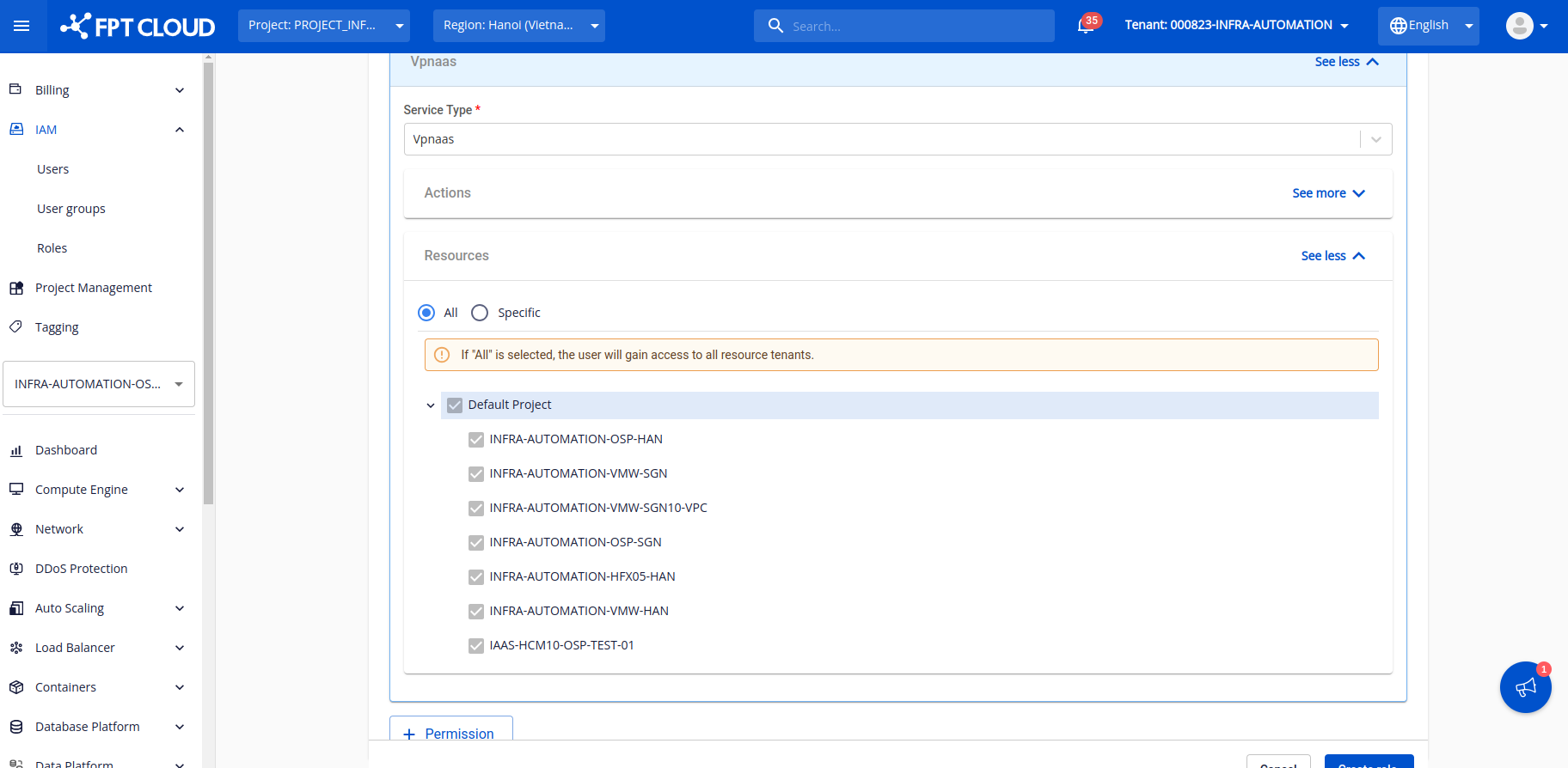Note : Đối với các dải mạng sử dụng máy chủ baremetal, quý khách hàng cần bổ sung thêm permission ở dịch vụ HPC kèm quyền “ListSubnet Sau khi hoàn thành các thông tin, click "Create role" để tạo. Bước 5: Khởi tạo user group và chọn roles “VPN_user” vừa khởi tạo ở bước trên Bước 6: Chọn tab User và click “Invite user” Bước 7: Điền user muốn sử dụng VPN và lựa chọn user group, roles Bước 8: Check mail của tài khoản được invite và truy cập dịch vụ để sử dụng