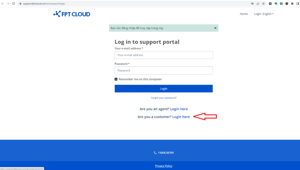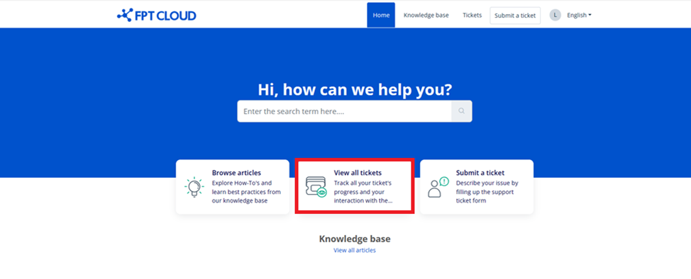 Bước 1: Truy cập vào trang support của FPT Cloud Cách 1: Truy cập trực tiếp vào đường link: https://support.fptcloud.com Đăng nhập với account đã đăng ký của bạn trên hệ thống của FPT Cloud. file Chọn Submit a ticket để khởi tạo yêu cầu support. file Cách 2 : Thông qua tương tác với FPT Cloud Zalo OA: Khách hàng chỉ cần gõ /support vào trong nhóm hỗ trợ chính thức giữa khách hàng và FPT Cloud trên Zalo hoặc chat trực tiếp với FPT Cloud Official Account. Lúc này Zalo sẽ gửi về cho bạn một đường link dẫn tới trang support của FPT Cloud. file file Sau khi nhấp vào đường link, giao diện trang web FPT Cloud Support hiện lên, bạn cần đăng nhập vào hệ thống để khởi tạo ticket. file Bước 2: Điền các thông tin cần thiết