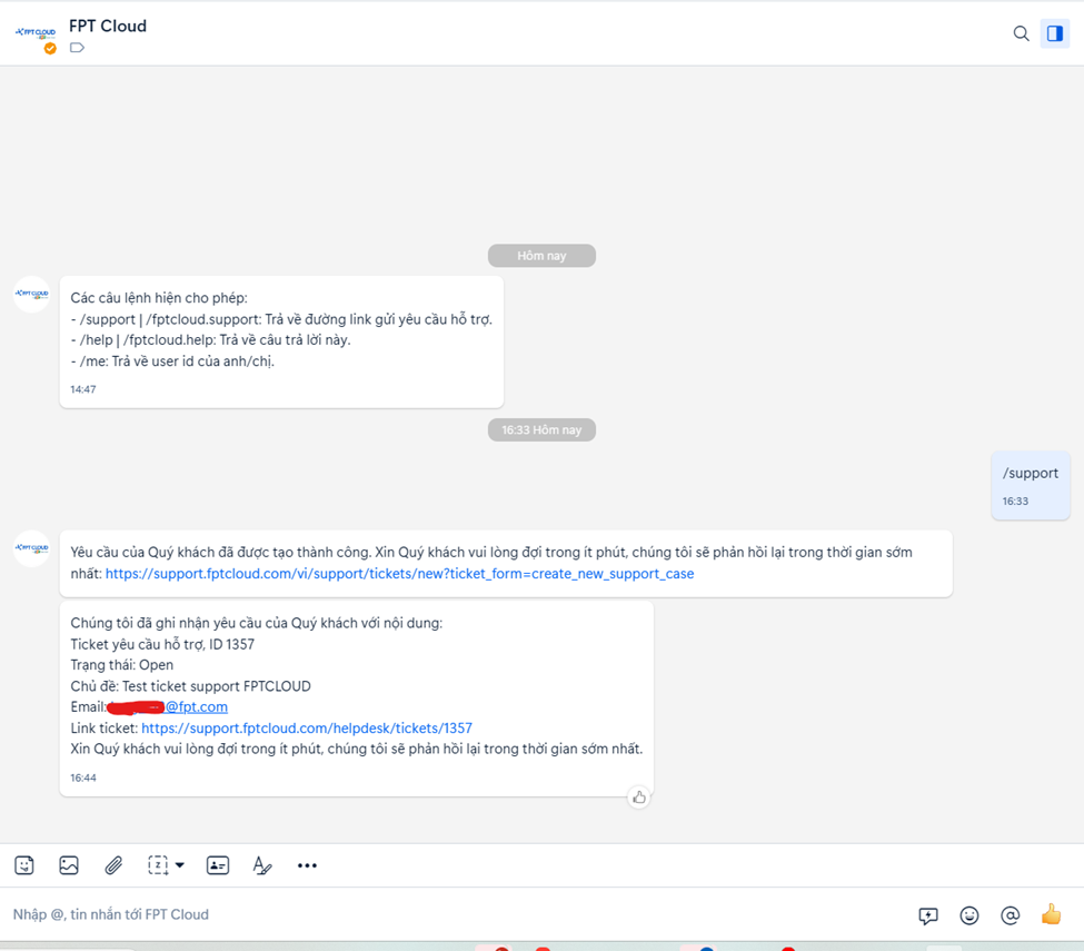 • Description: Mô tả chi tiết về vấn đề cần hỗ trợ của bạn file Sau khi nhập các thông tin và chọn Submit. Yêu cầu của bạn sẽ được ghi nhận trên hệ thống. Đồng thời hệ thống support của FPT Cloud sẽ gửi email xác nhận yêu cầu hỗ trợ đã được khởi tạo thành công. file Bước 3: Bật tính năng nhận thông báo trạng thái ticket tự động qua Zalo