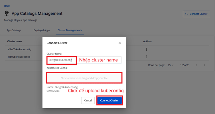 • Bước 1 : Chuẩn bị một k8s cluster để deploy ứng dụng, yêu cầu sử dụng kubeconfig để thực hiện Connect cluster
