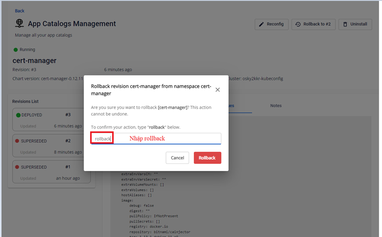 app-catalogsRollback app ve cau Hinh cuRollback App Ve Cau Hinh Cu Hệ thống cho phép người dùng có thể rollback applications về cấu hình cũ Bước 1 : Tại màn hình xem chi tiết thông tin app chọn Rollback to # Bước 2 : Nhập Rollback để xác nhận thông tin Bước 3 : Kiểm tra thông tin sau khi rollback: