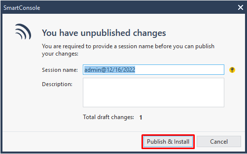 Lưu ý: Bất kỳ thay đổi nào trên SmartConsole cần phải Install Policy mới được lưu và áp dụng. Bước 1: Chọn Install policy (Ctrl + Shift + Enter) > chọn Publish & Install > chọn Install. Userguide Checkpoint FPT NGFW 2022 40 Userguide Checkpoint FPT NGFW 2022 41 Userguide Checkpoint FPT NGFW 2022 42 Bước 2: Kiểm tra việc Install đã thành công. Userguide Checkpoint FPT NGFW 2022 43