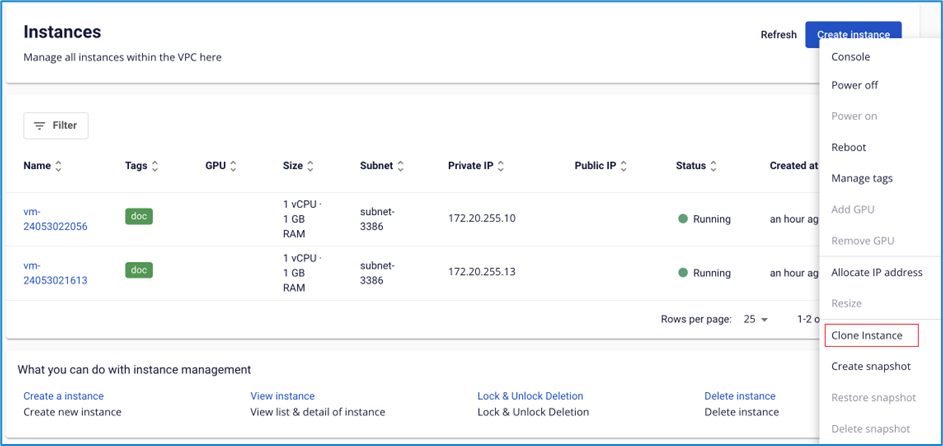 Tính năng Clone instance giúp tạo ra instance mới giống với instance gốc. Bước 1 : Người dùng chọn Instance cần Clone, chọn Actions , chọn Clone instance . Tính năng có thể sử dụng khi instance đang ở trạng thái Power on hoặc Power off. Một số lưu ý: