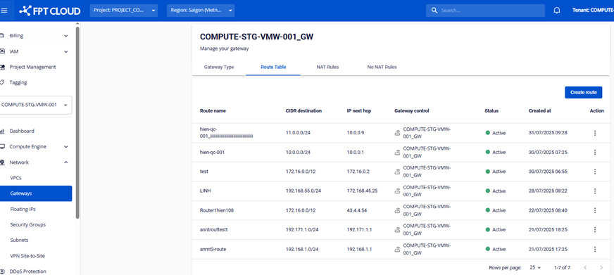 Ở màn hình này, người dùng thể quản lý được danh sách Gateway của 1 VPC