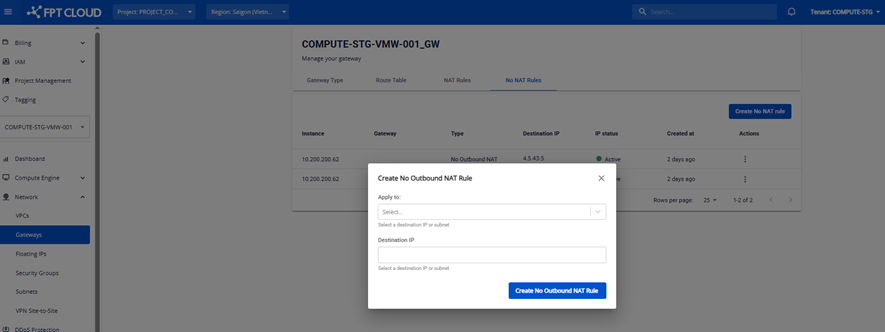 Hệ thống cho phép người dùng quản lý NO NAT rule trong từng Gateway