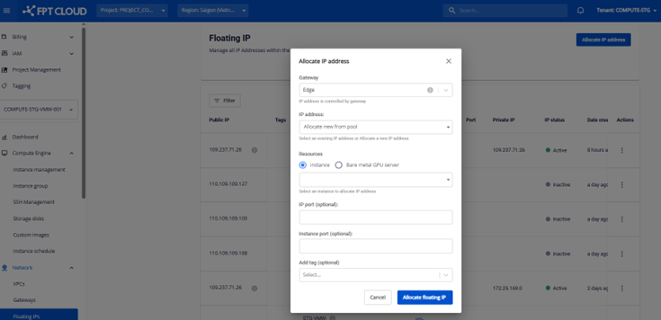 - Ở màn hình Floating IP, hệ thống cho phép người dùng chọn Gateway khi Allocate IP, hover vào tooltip ở thông tin của Gateway để biết được Gateway loại Basic hay Custom