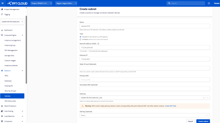 - Ở màn hình tạo Subnet, hệ thống cho phép người dùng chọn Gateway. Nếu Gateway loại Custom, hệ thống sẽ thông báo người dùng tự tạo NAT rule