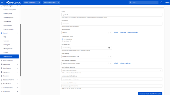 - Hệ thống cho phép user chọn Gateway khi tạo và sử dụng dịch vụ VPN Site to Site