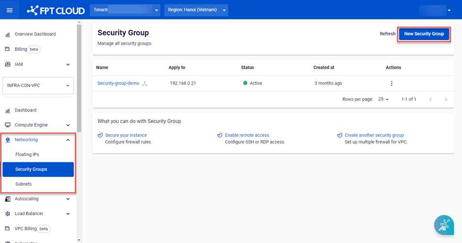 Để quản lý các Security group , người dùng vào trang Security Groups ở nhóm Service Networking. Ở đây người dùng có thể tạo mới, xem danh sách, sửa thông tin, xóa các Security group trong VPC.