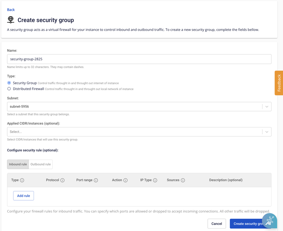 - Name : Tên security group, mặc định hệ thống sẽ tự khởi tạo một tên để khách hàng nhanh chóng sử dụng.