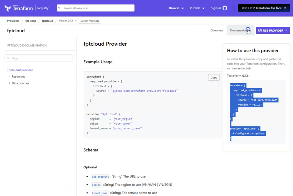 - Kiểm tra phiên bản và hướng dẫn cài đặt FPT Cloud Provider trên trang Terraform