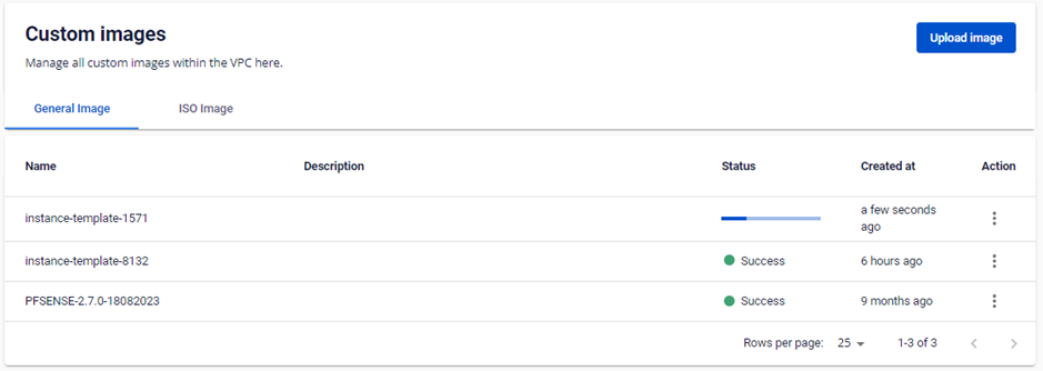 Bước 1 : Trên trang Instance Management , bấm vào Actions trên mỗi instance và chọn Create Template file Bước 2 : Điền đầy đủ thông tin template và bấm nút Create template Bước 3 : Hệ thống chuyển đến trang Custom images , người dùng có thể xem trạng thái và tiến trình khởi tạo template file file