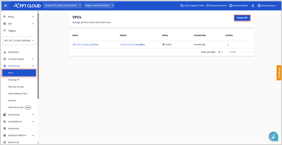 Để khởi tạo một VPC mới, người dùng cần đăng nhập vào hệ thống với phân quyền Tenant Owner