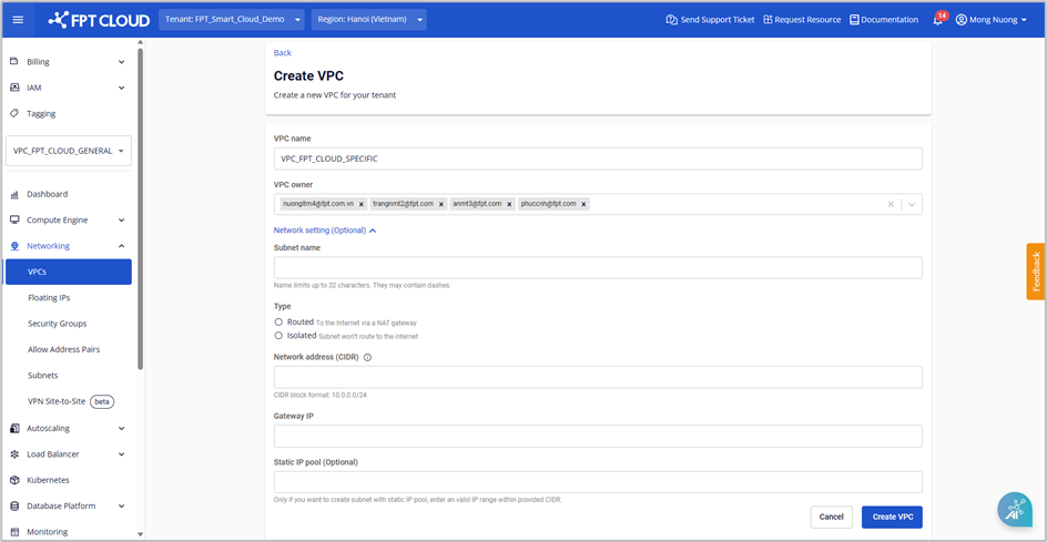 - VPC owner : Chọn tài khoản được cấp phân quyền VPC Owner. Để giúp quá trình khởi tạo nhanh chóng, hệ thống sẽ chọn sẵn tài khoản đang khởi tạo làm VPC để cấp phân quyền VPC owner.