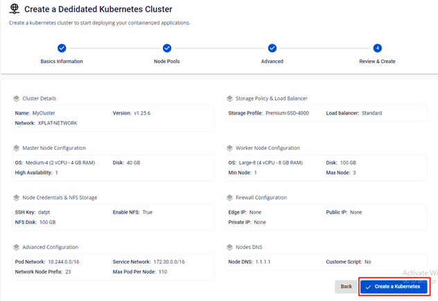 The system will display a screen to confirm all entered information, to check the resources and proceed with the process of initializing the Kubernetes Cluster based on the selected configuration.