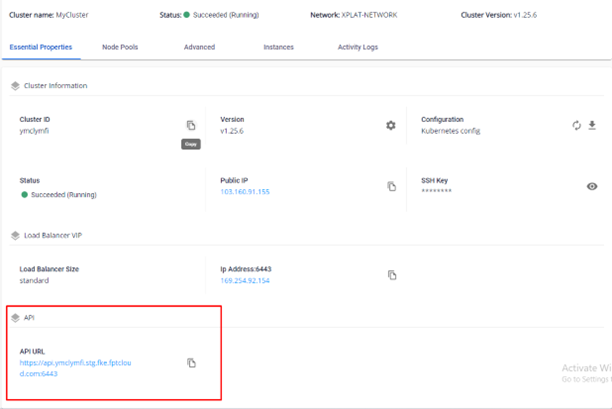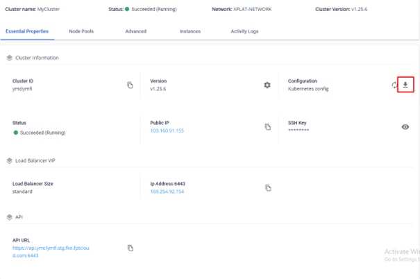 Step 3 : In Essential Properties > Cluster Information > Configuration tab, you can download the .kubeconfig file to log in to the Cluster using kubectl or other tools.