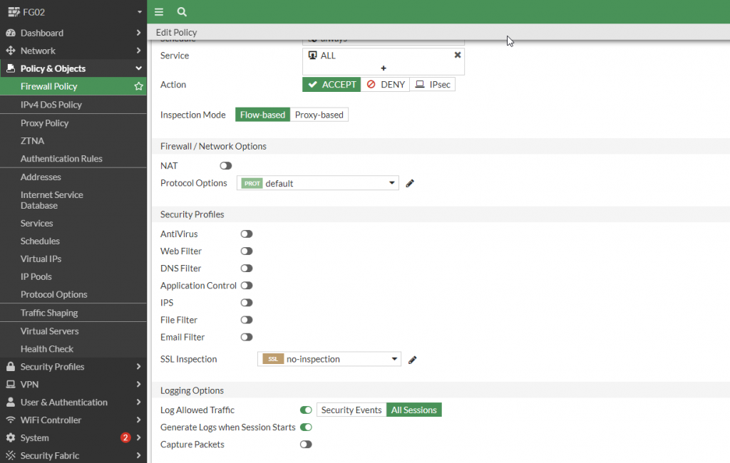 Khi tạo các Firewall Policy các traffic kết nối sẽ hiển thị logs ở mục Forward Traffic sau khi đã chọn chế độ Generate Logs When Session Starts.