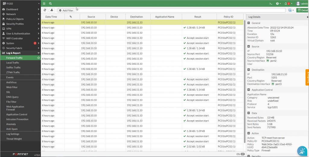 - Log & Report > Forward Traffic. Double Click vào từng log để xem chi tiết