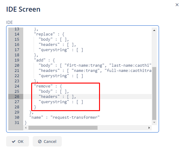 For example : Removing certain fields in the request transformer: In case you want to remove one or more fields in the body / headers / query string of a request, input the data you want to change in the respective section.