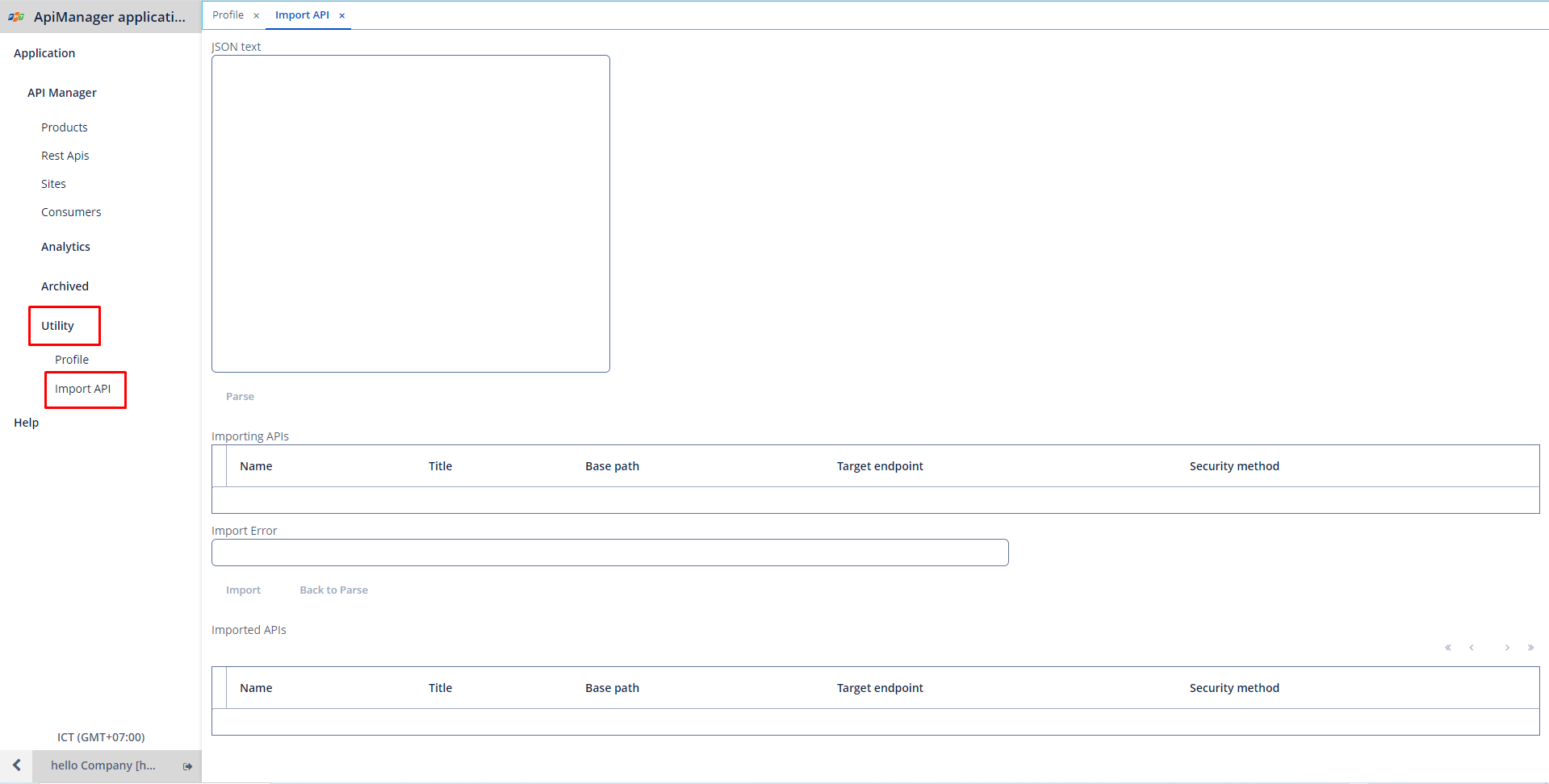Step 3 : Click Parse > then click Import. The successfully declared APIs will be displayed in the Import APIs table. If any errors occur, error messages will be shown in the Import Error section.
