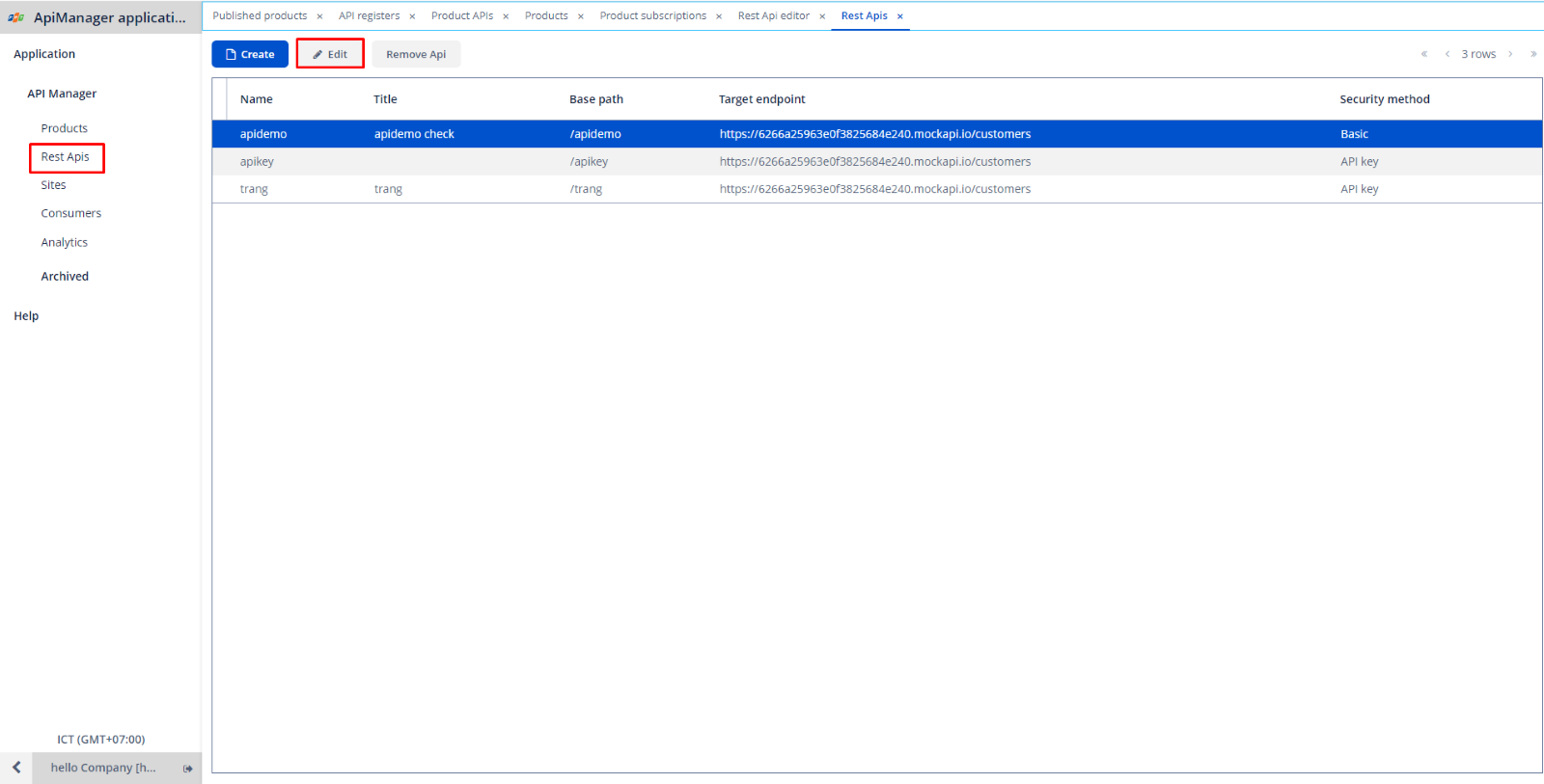 Step 1 : In the Application menu, go to API Manager > Rest APIs > select an API > Edit.