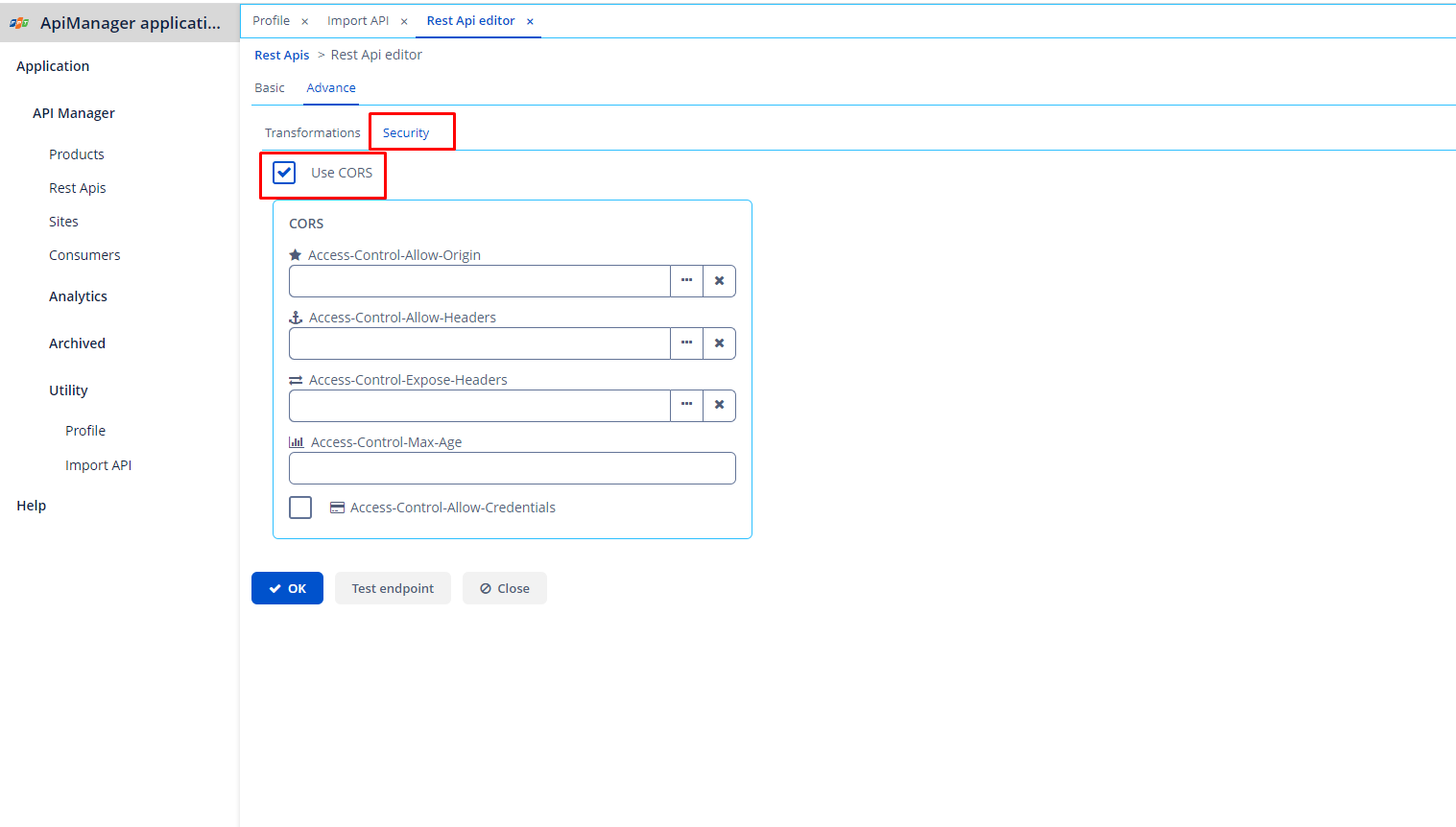 Step 2 : Select the Advanced tab > Select the Security tab > tick the Use CORS checkbox.