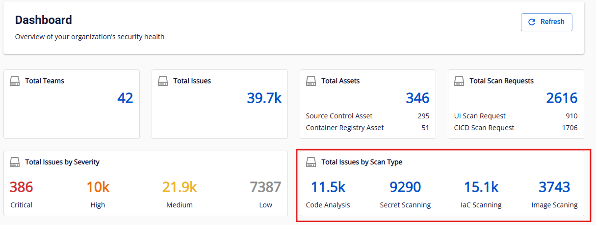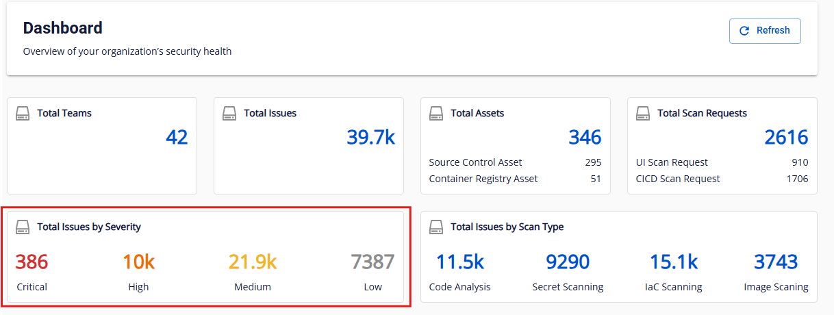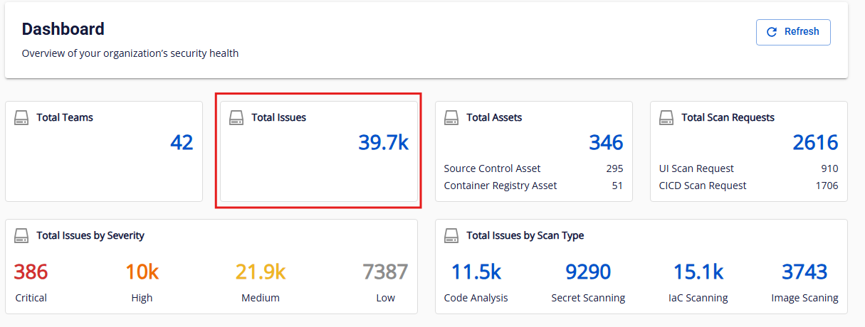 Mô tả: Tổng số issue được ghi nhận trong lần quét thành công gần nhất của toàn bộ asset trong org (bao gồm team và subteam). Định dạng hiển thị:
