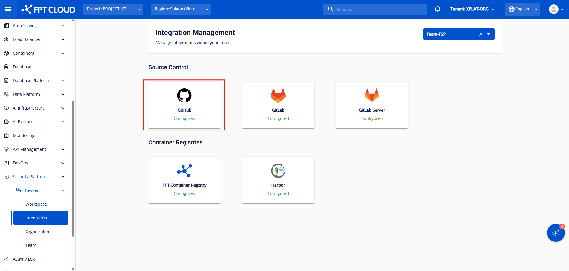 Chỉ Org Admin hoặc Team Manager có quyền xem chi tiết các loại tích hợp Sau khi đã chọn org/team, nhấn vào Configured GitHub để xem tình trạng configure anhfsec Ở đây, bạn có thể thấy các thông tin như Personal Access Token , Repository Access , Integrated at , và Access Key phục vụ cho tích hợp CICD anhfsec Bạn có thể tiến hành Reintegrate hoặc Disable tích hợp GitHub