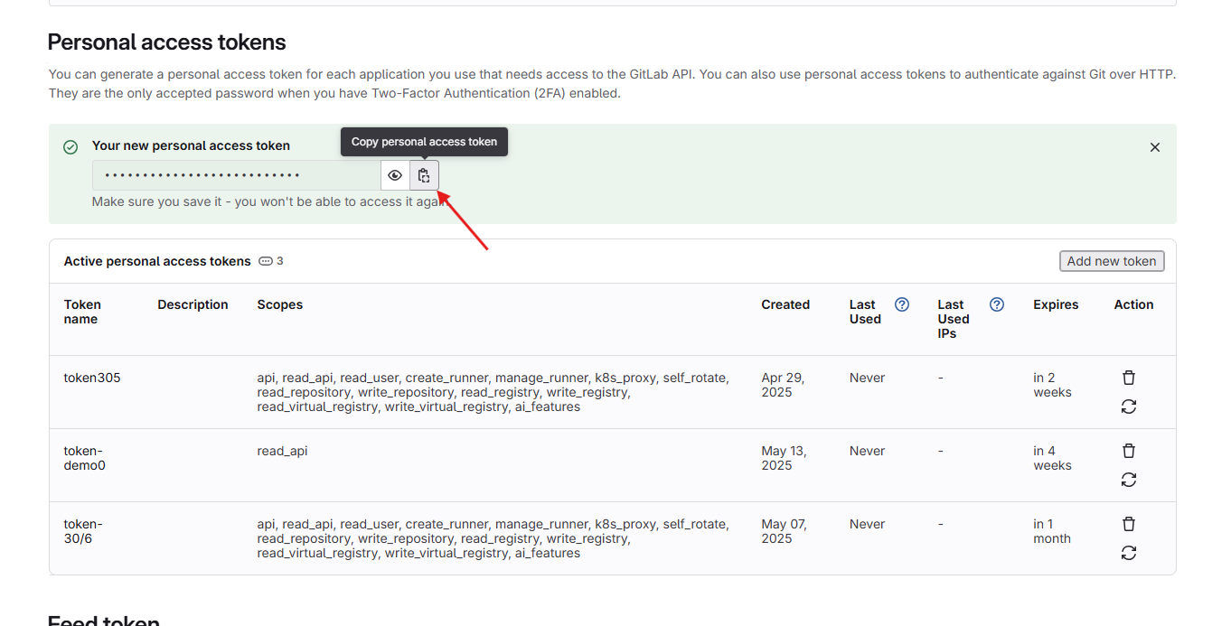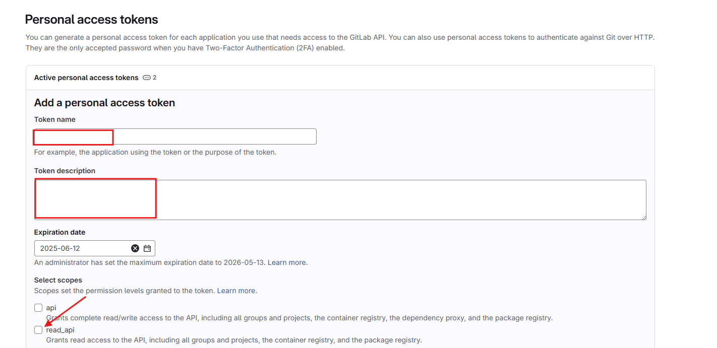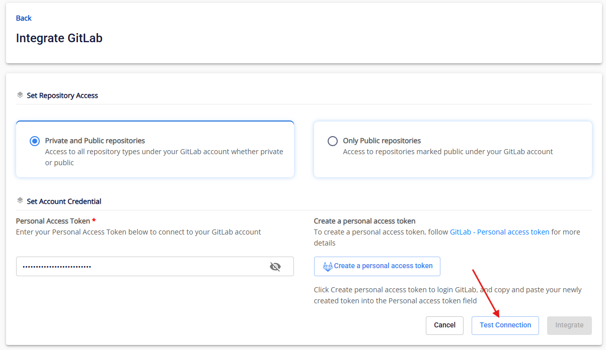 Bước 1 : Sau khi đã chọn org/team, nhấn vào GitLab để đến màn tích hợp GitLab Cloud: anhfsec Bước 2 : Sau khi thiết lập quyền truy cập vào Private/public repository, nhấn vào Create a personal access token , sau đó bạn sẽ được chuyển đến GitLab Login để tạo token anhfsec Bước 3 : Điền thông tin như Token nameToken Description và tích vào read_api anhfsec anhfsec Bước 4 : Copy personal access token anhfsec Bước 5 : Điền Personal Access Token vừa tạo và nhấn Test Connection anhfsec Lúc này hệ thống sẽ kiểm tra các miền bắt buộc và valid Personal Access Token , nếu một trong hai failed, màn hình sẽ hiển thị thông báo Test connection Failed(invalid PAT) Nếu thành công, màn hình sẽ hiển thị Test connect successfully Bước 6 : Nhấn vào Integrate anhfsec