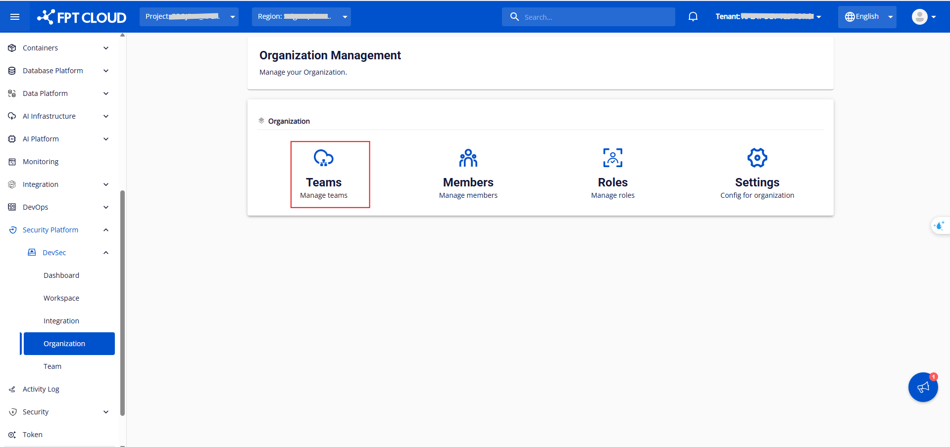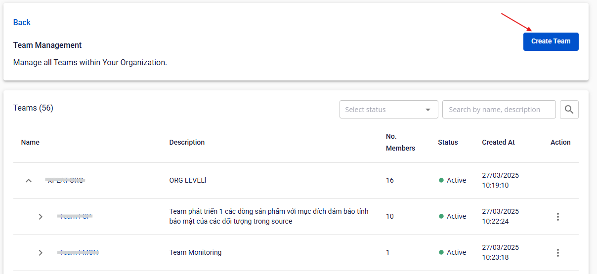 Nhấn vào Team trong phần Organization anhfsec Tại đây, bạn có thể xem các thông tin như Name , Description , Number of Members ,Status , Created at và có thể dựa vào các thông tin trên để tìm kiếm và thực hiện các thao tác khác lên đội nhóm như Create Team , Create Sub-team ,Edit , Disable/EnableDelete