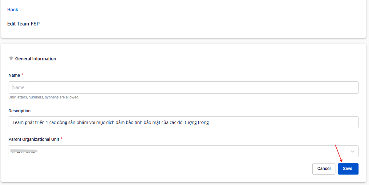 Chỉ Org AdminTeam Manager có quyền chỉnh sửa Bước 1 : Nhấn vào phần Edit ở phần Action của Team anhfsec Bước 2 : Điền hết thông tin như Org Name , Org DescriptionParent Org Unit anhfsec Bước 3 : Nhấn Save.